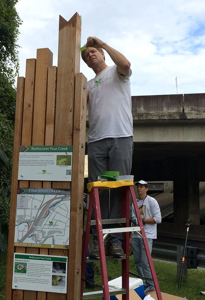 SFC board member Warner McConaughey installs signs at Lindbergh and Meadow Trail.